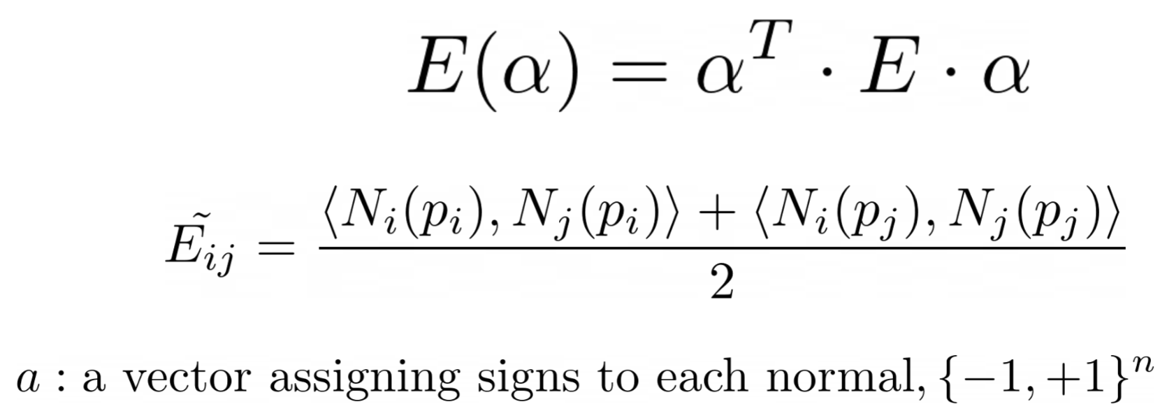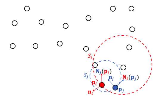 - Alignment energy of neighboring points: based on the average directional similarity when projected onto the other point's corresponding implicit surface